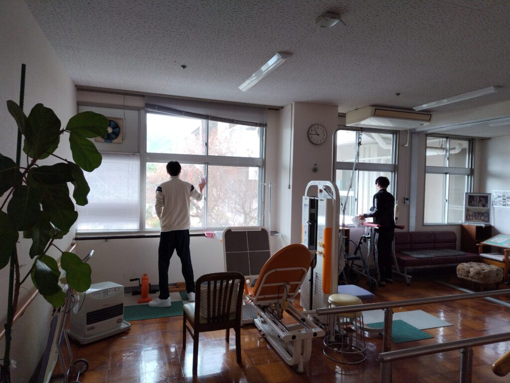 清掃活動では、2階ベランダや窓、居室内のベッド周りの清掃、1階の窓拭きや中庭の清掃を行っていただきました。
